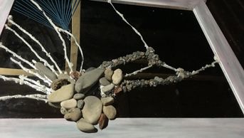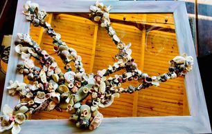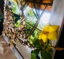 With the stabilizing rocks and pebbles in place following the glued pattern and dry, it’s now time to play with the pretty stuff! Glorious Shells! Have fun with placement and be creative... I incorporated a petrified fish vertebrae to act as a flower ring to hold one of our gorgous local Costa Rican blossoms!