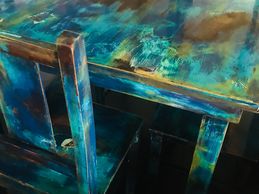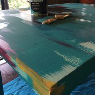 Layer paints in different areas on the surface of the table and chairs... be whimsical! I used the lighter colors first so they would add more depth as an undertone once I sanded the pieces in the upcoming steps.